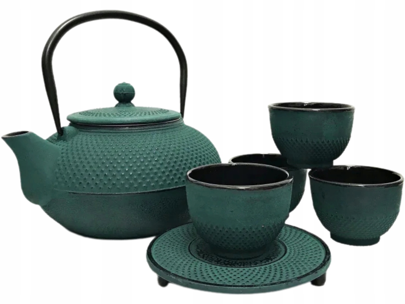 ZIELONY ŻELIWNY Czajnik 1,5 l Z zaparzaczem + 4 Czarki 150 ml + Podstawka
