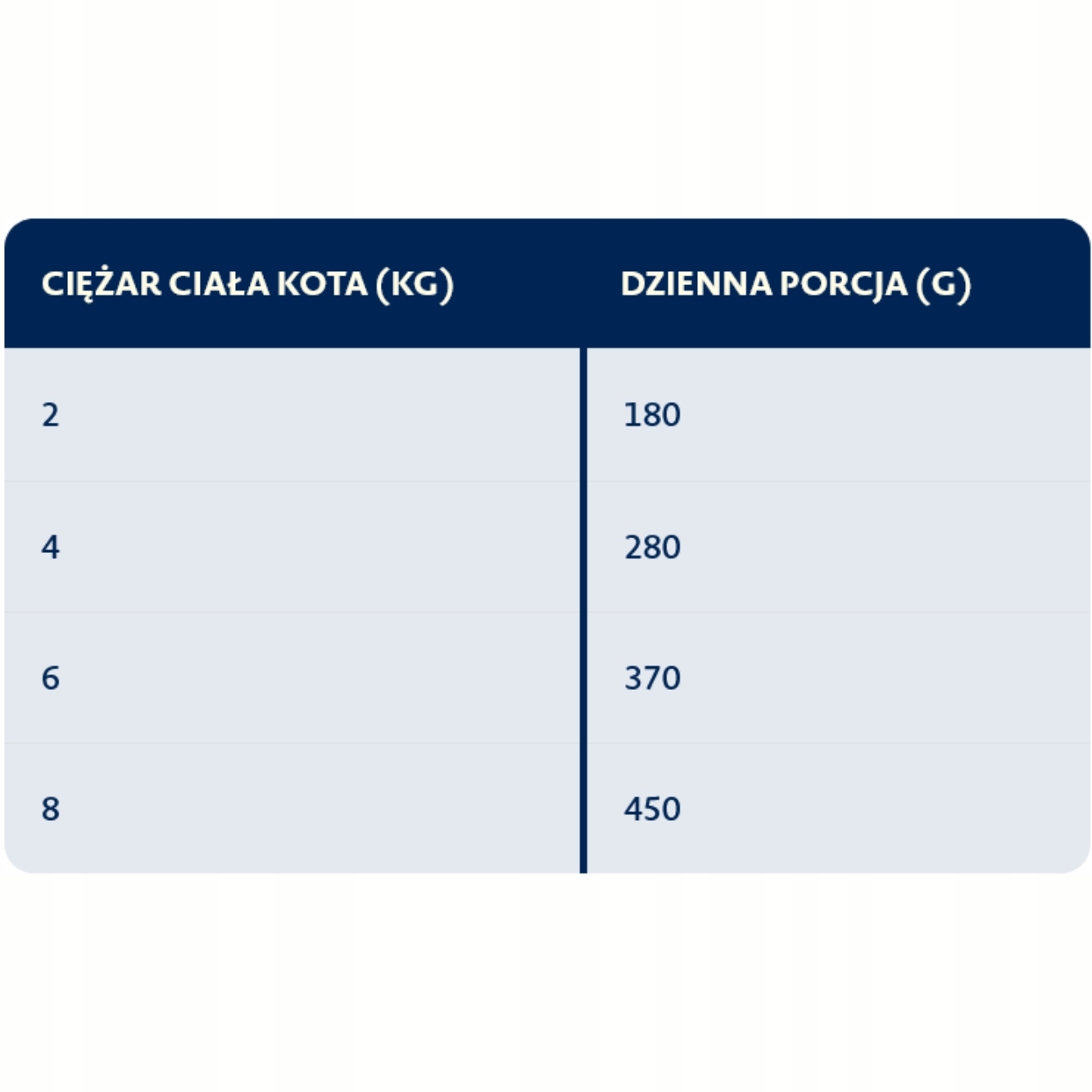 Proszę zwrócić uwagę, że są to jedynie wskazówki. Rzeczywiste zapotrzebowanie może zależeć od konkretnego zwierzęcia. Proszę dostosować wielkość porcji do poziomu aktywności kota.