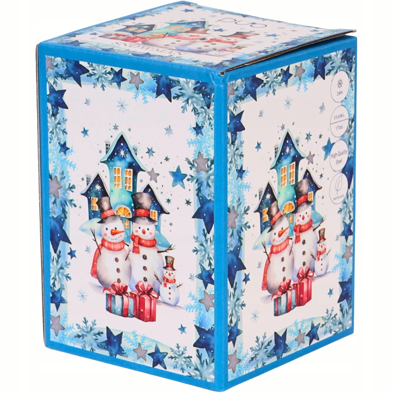 Kubek termiczny z podwójnymi ściankami - ozdobiony motywem wesołej rodziny bałwanków, na tle malowanych domków w pastelowych odcieniach błękitu i niebieskiego. Zimowy krajobraz, uzupełniony o świąteczne detale, doskonale wprowadza w bożonarodzeniowy nastrój