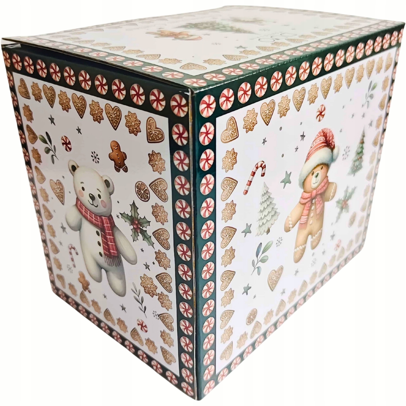 • Elegancki, duży porcelanowy kubek zdobiony motywem słodkich pierniczków, gałązek jemioły, gwiazdek i słodkości otaczających dwa urocze misie w zimowych szalikach i czapeczkach. Wzornictwo i kolorystyka nadają kolekcji uroku i wyjątkowego gwiazdkowego nastroju
